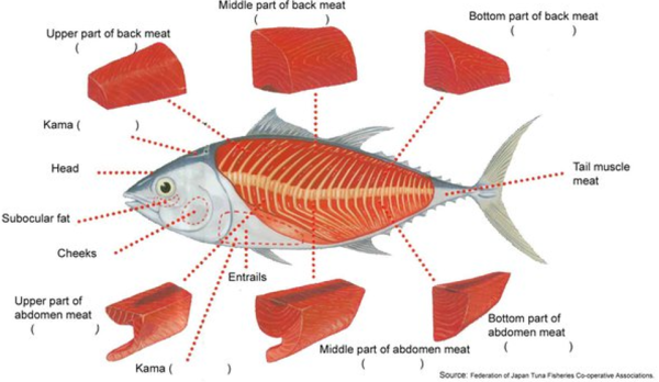 Campuran daging merah dan lemak. Favorit untuk sashimi premium. -